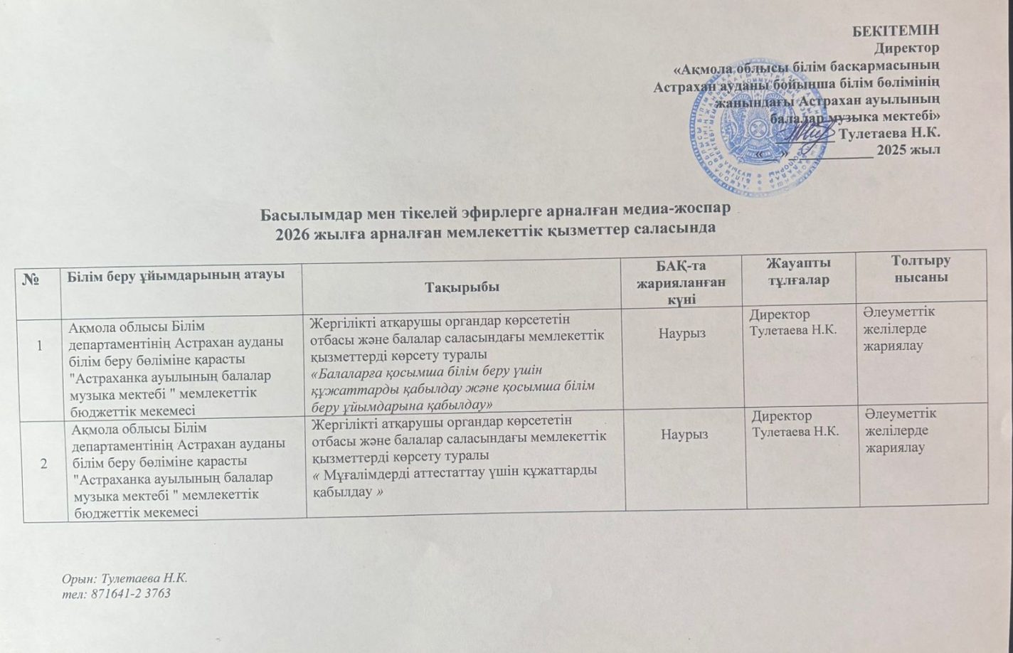 Басылымдар мен тікелей эфирлерге арналған медиа-жоспар 2026 жылға мемлекеттік қызметтер саласында