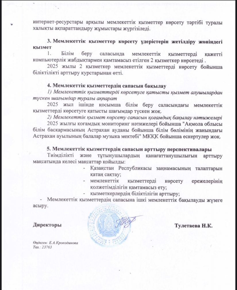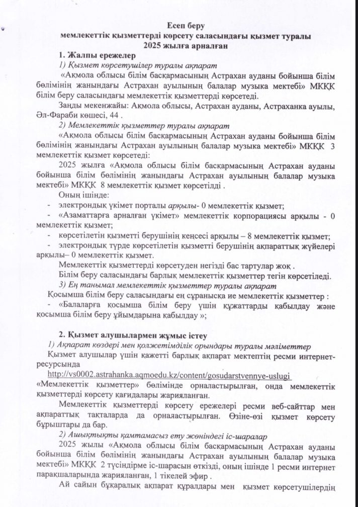 2025 жылға арналған " Ақмола облысы білім басқармасының Астрахан ауданы бойынша білім бөлімінің жанындағы Астрахан ауылының балалар музыка мектебі" МКҚК мемлекеттік қызмет көрсету саласындағы қызметі туралы есеп.